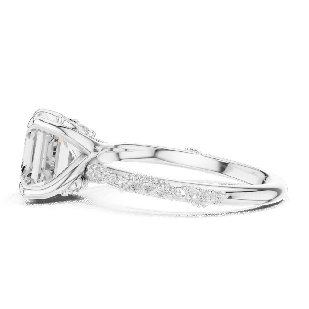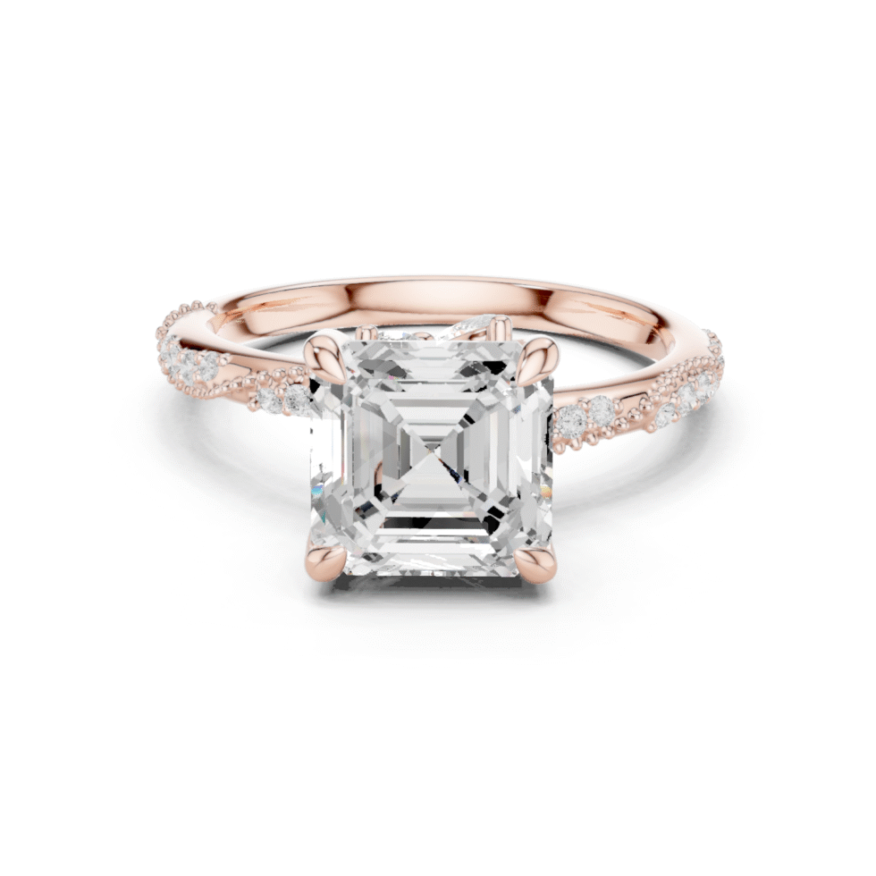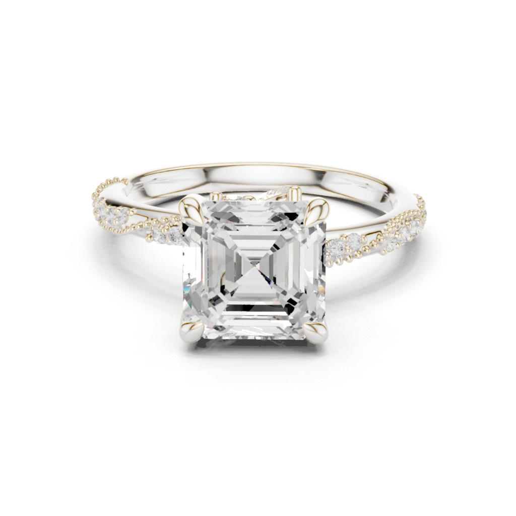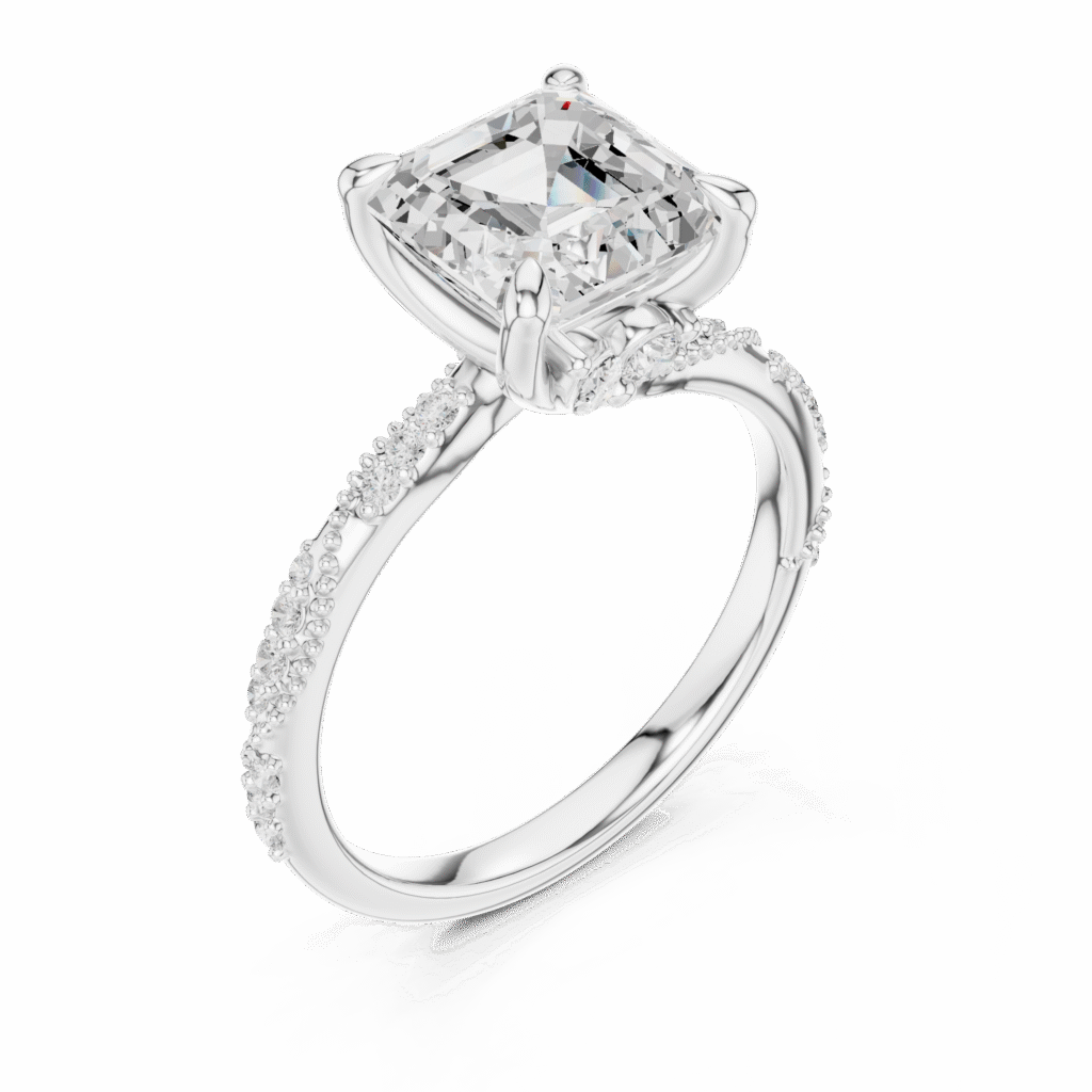 Celebrate timeless elegance with this breathtaking Asscher-Cut Radiance Twist Engagement Ring. Featuring a stunning, precision-cut Asscher center stone, the ring showcases mesmerizing step-cut facets that reflect light with exceptional clarity and brilliance. The stone is secured in a classic four-prong setting, allowing maximum visibility and sparkle.