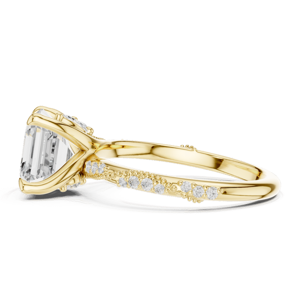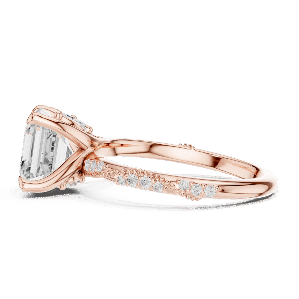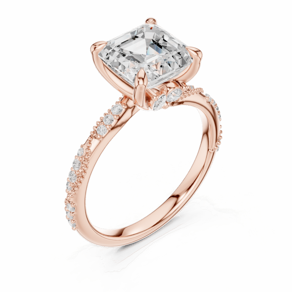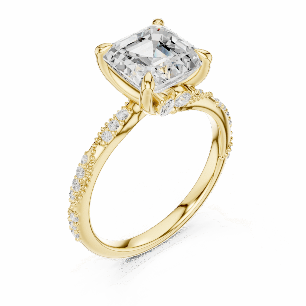 Celebrate timeless elegance with this breathtaking Asscher-Cut Radiance Twist Engagement Ring. Featuring a stunning, precision-cut Asscher center stone, the ring showcases mesmerizing step-cut facets that reflect light with exceptional clarity and brilliance. The stone is secured in a classic four-prong setting, allowing maximum visibility and sparkle.